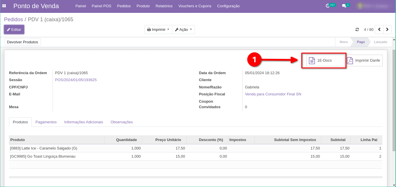 4. Acesse a NFCe ao clicar no botão "1E-Docs"