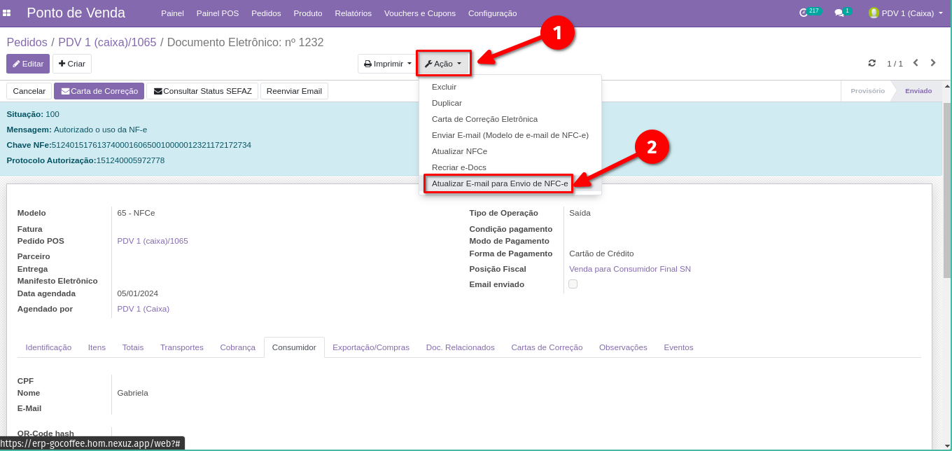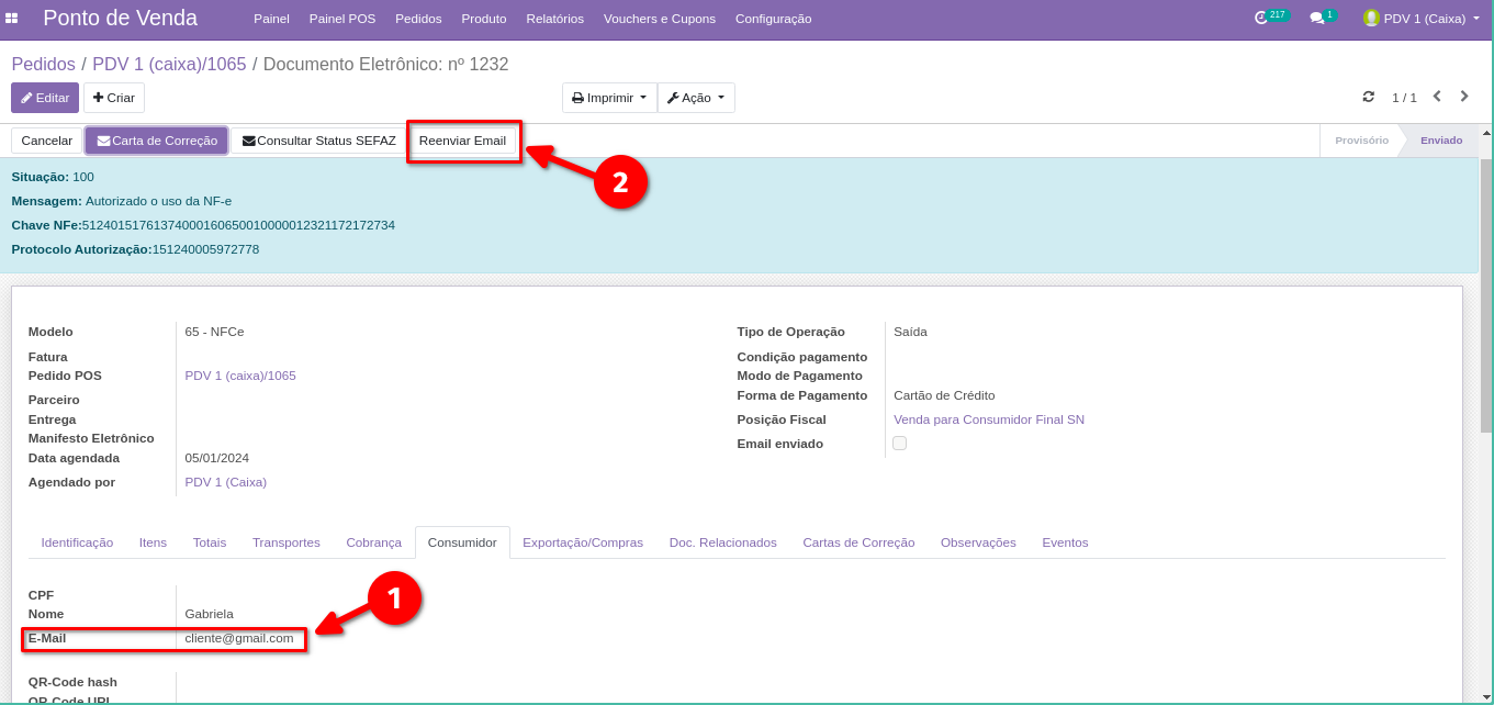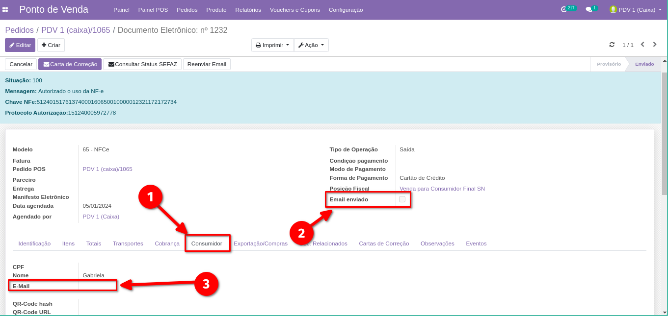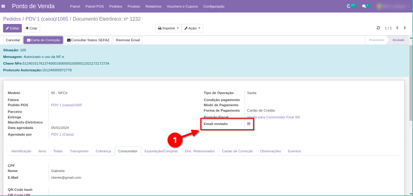 10. Quando a opção "Email enviado" consta como marcada, significa que o e-mail com a NFCe foi enviado ao e-mail cadastrado.